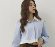 撞色拼接單口袋長袖短版襯衫