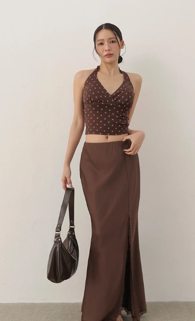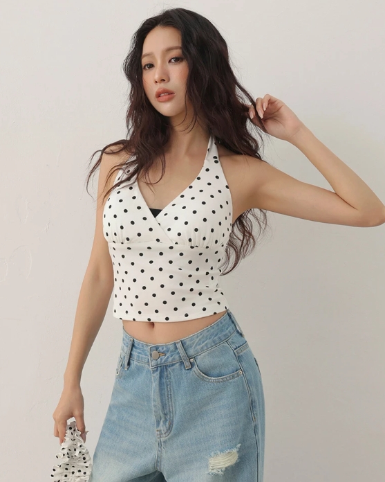 經典的波點圖樣配上交叉V領與胸下抓皺拼接設計,充滿復古氣息。繞頸綁帶可自由調整,讓背影也迷人。內附胸墊提供穩定支撐。短版剪裁兼具性感與俏皮,是打造歐美時髦風的必備單品。