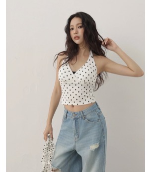 經典的波點圖樣配上交叉V領與胸下抓皺拼接設計,充滿復古氣息。繞頸綁帶可自由調整,讓背影也迷人。內附胸墊提供穩定支撐。短版剪裁兼具性感與俏皮,是打造歐美時髦風的必備單品。