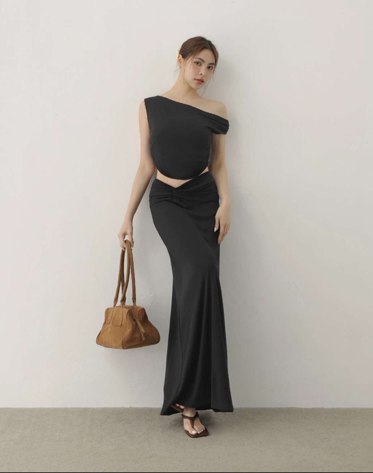不對稱領口打破常規,映襯出肩頸的骨感線條。側邊抓皺細節,不僅賦予自然的褶皺感,更能在視覺上收攏腰身,短身版型瞬間拉長下身比例。簡單搭上高腰寬褲或長裙,即可完成性感的極簡穿搭風格。