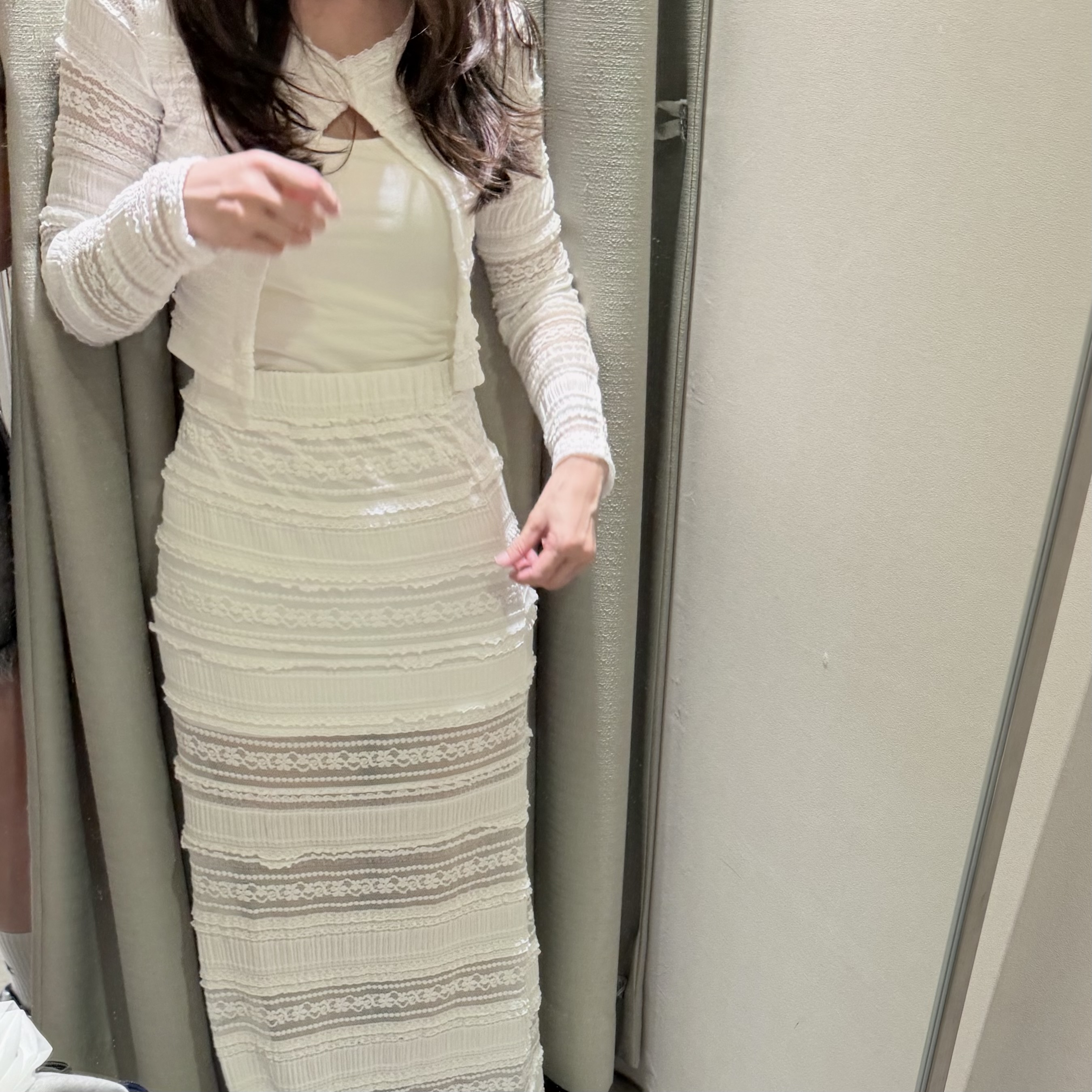 長度偏長,我穿會拖地,很好看精緻的蕾絲布料!整套搭起來很美喔!