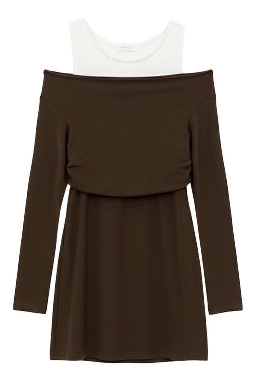 透過一字領與背心的假兩件設計,營造出層次感。貼合身形的短洋裝樣式,搭配側邊抓皺細節,除了強化腰部線條,也具有顯瘦效果,穿起來更顯身材。