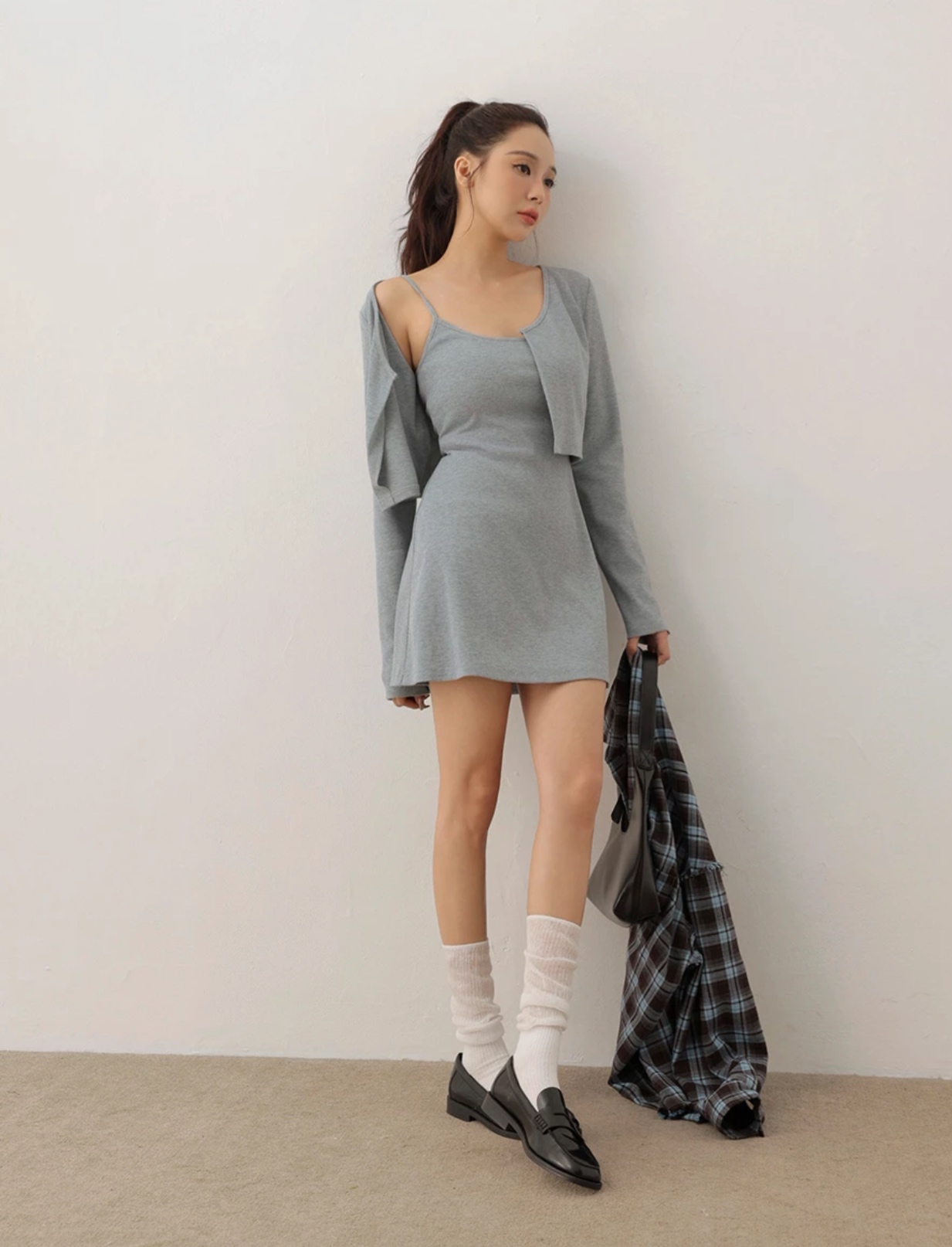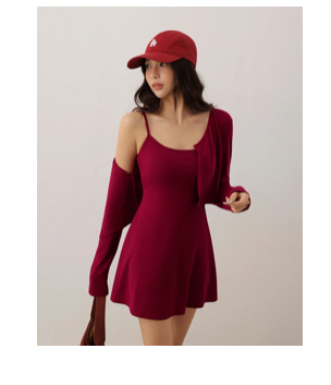 圓領細肩帶BRA短洋裝長袖勾扣羅紋開襟罩衫套裝