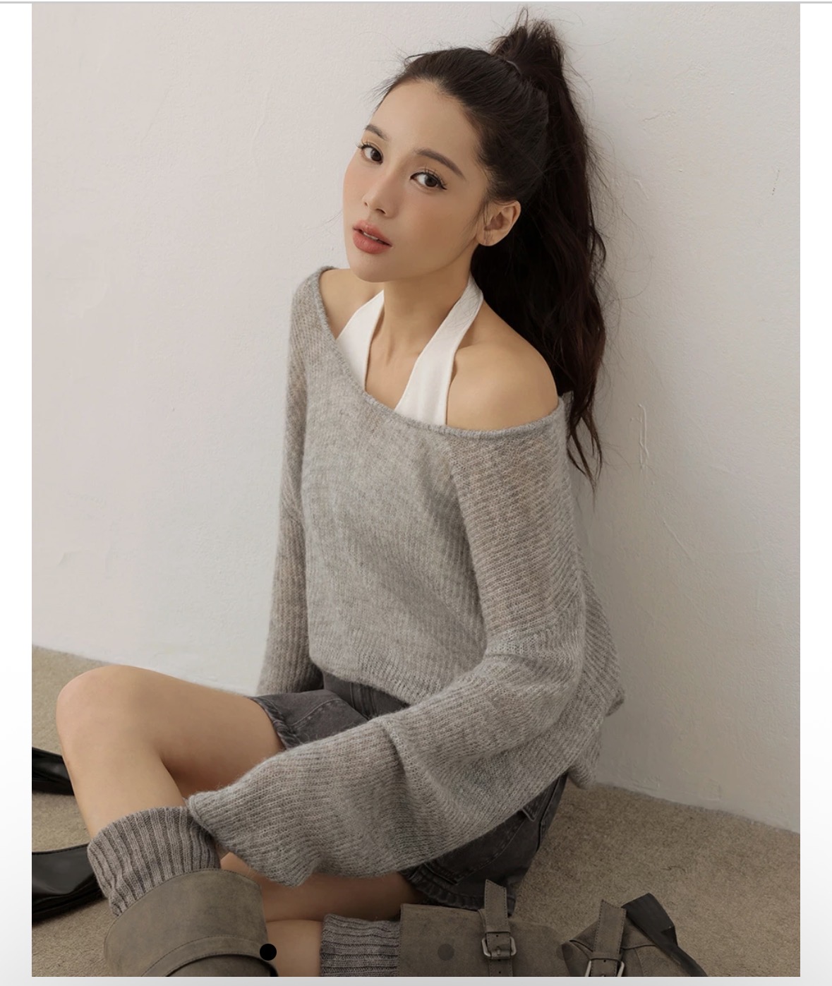 結合了繞頸背心與大圓領針織衫的假兩件設計,露出鎖骨與肩線,層次明確又不顯刻意。寬鬆短版剪裁模糊身形曲線,搭配短裙短褲可對比出腿部的纖細感。是一款不須費心思考穿搭的單品。