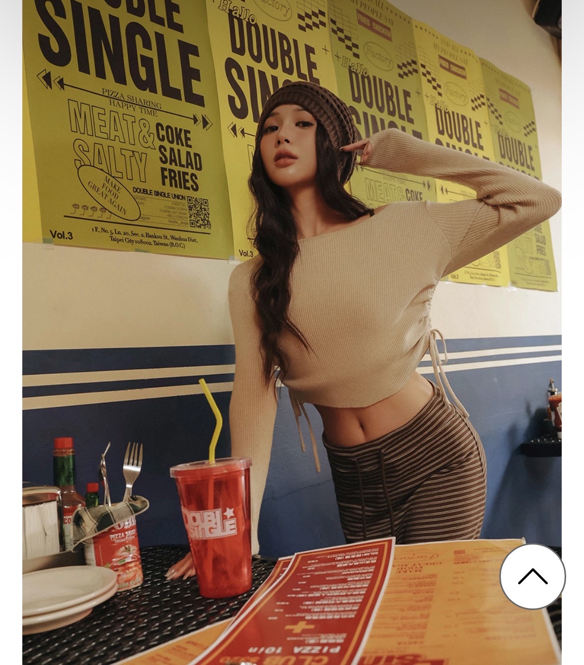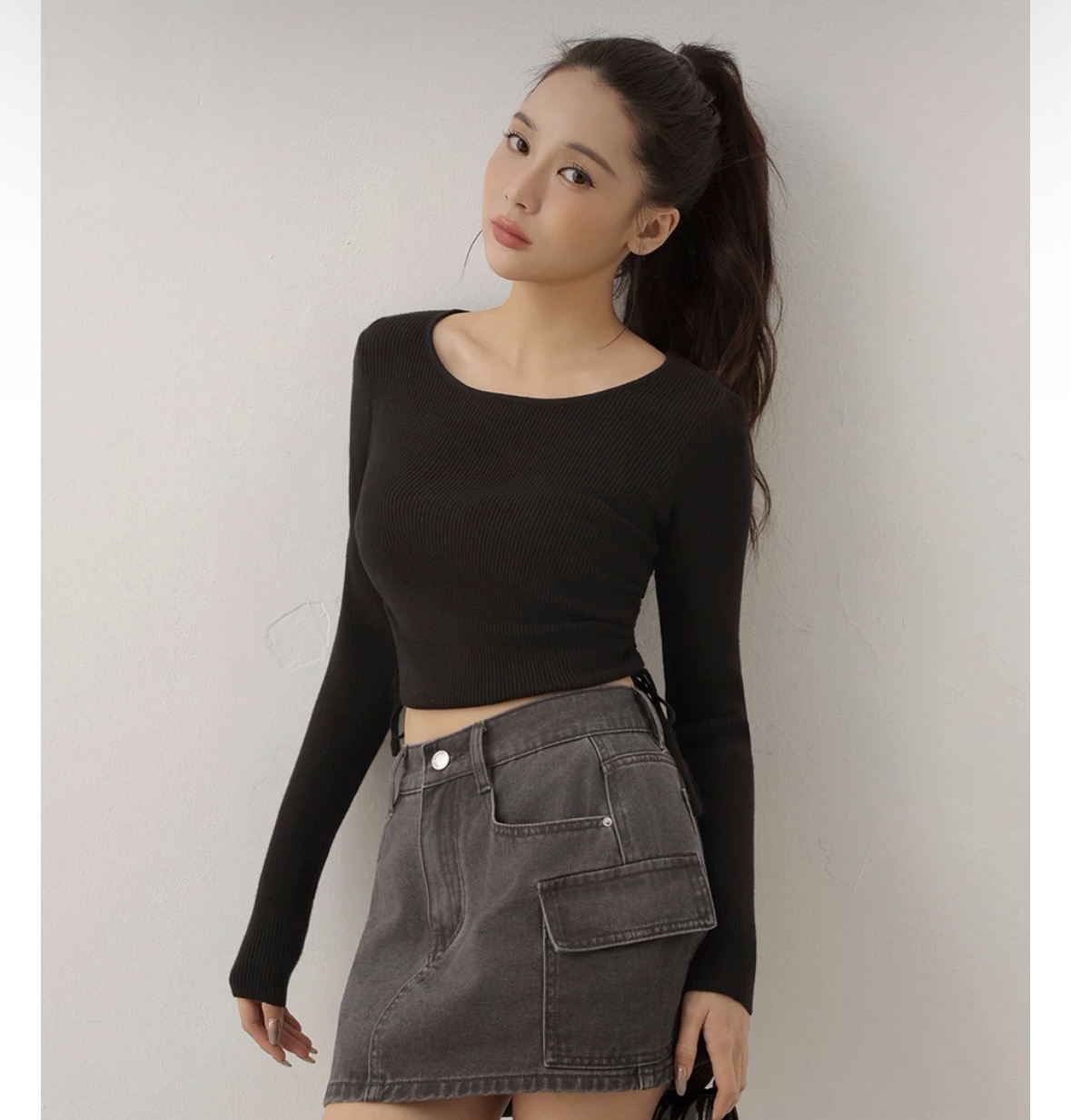 大圓領側抽繩抓皺長袖短版羅紋針織衫