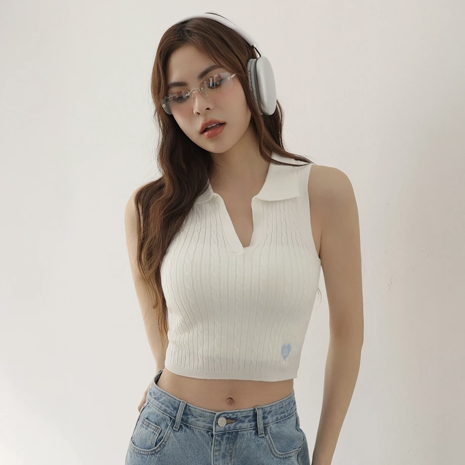 V型翻領設計可修飾臉型,並微露鎖骨線條,具有顯瘦效果。合身短版剪裁美化調整上身與下身的比例。下擺精緻的愛心刺繡成為這款背心的重點點綴。搭配水洗牛仔褲就是帶點美式學院風的街頭流行穿搭。