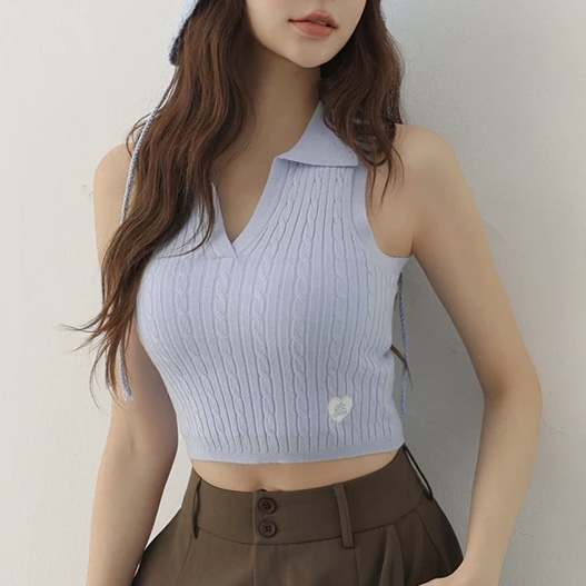 V型翻領愛心刺繡麻花羅紋短版針織背心