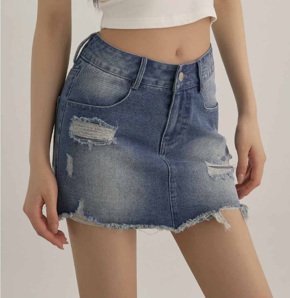 中腰剪裁能適度修飾腰腹。刷破加工設計與下擺不收邊抽鬚,為這款牛仔短裙注入帥氣個性。搭配合身短版上衣即可瞬間創造出比例完美且具備設計感的日常穿搭。